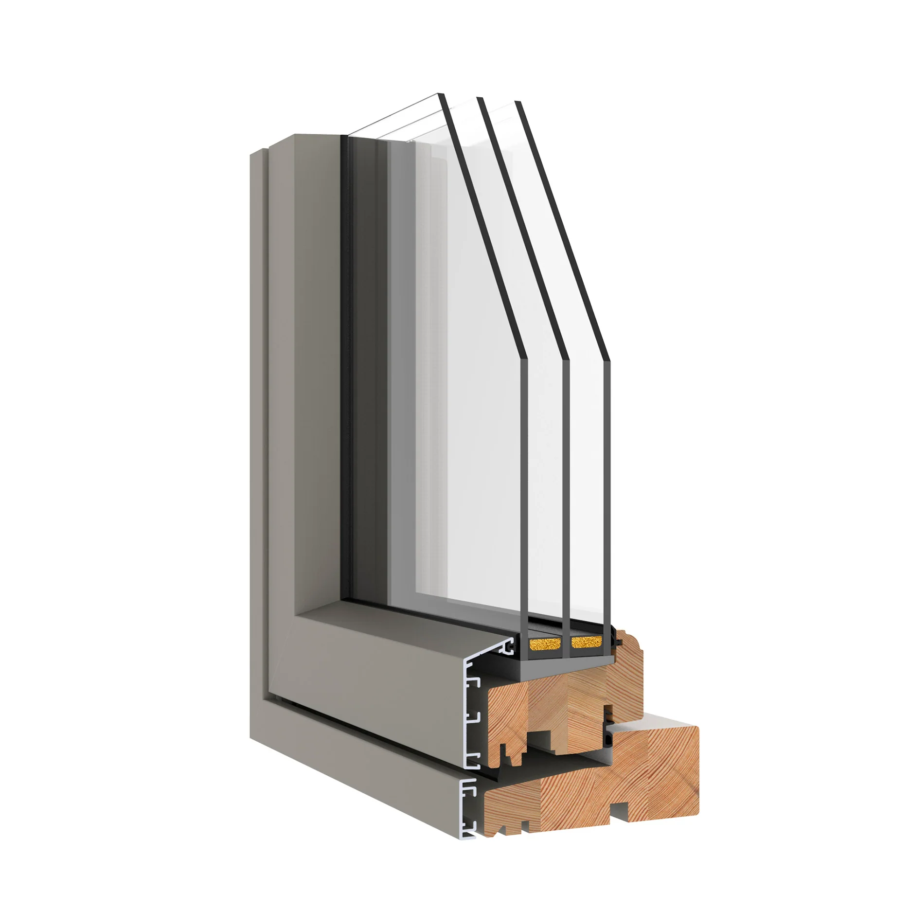 A triple-glazed timber outward opening window with external aluminium cladding.